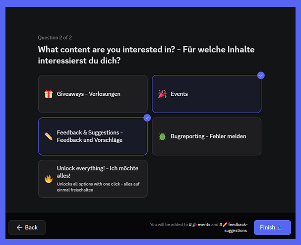 When you first join, you’ll see a short onboarding process. Choose your interests and preferred channels — this will automatically unlock the areas of the server most relevant to you.