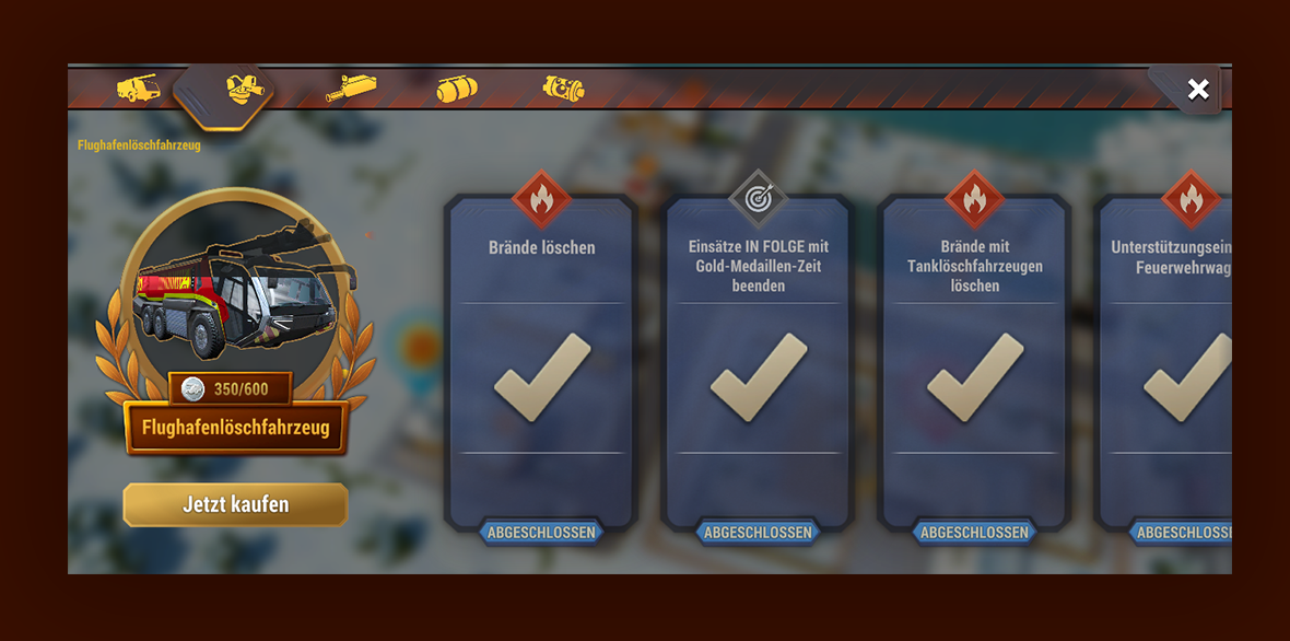 Es stehen mehrere Aufgaben gleichzeitig zur Verfügung, aus denen du auswählen kannst, um die benötigte Anzahl an Flughafenlöschfahrzeug-Marken (FLF-Marken) zu verdienen.