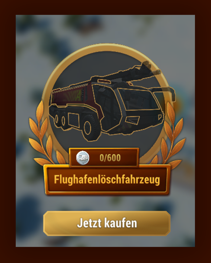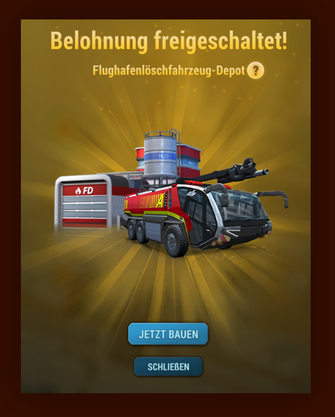 Du schreitest von links nach rechts voran und beginnst mit dem Freischalten des neuen Flughafenlöschfahrzeuges.