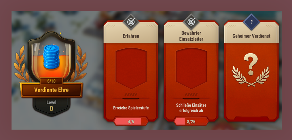Diese Verdienste bleiben verborgen, bis du sie freischaltest. Probiere unterschiedliche Aktivitäten aus und entdecke alle Bereiche des Spiels – du weißt nie, was sich als geheimer Verdienst entpuppen könnte.